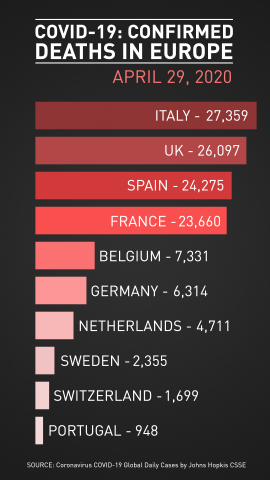 - Spain reported daily deaths of 325, up from 301 the previous day. The country's overall toll now stands at 24,275.