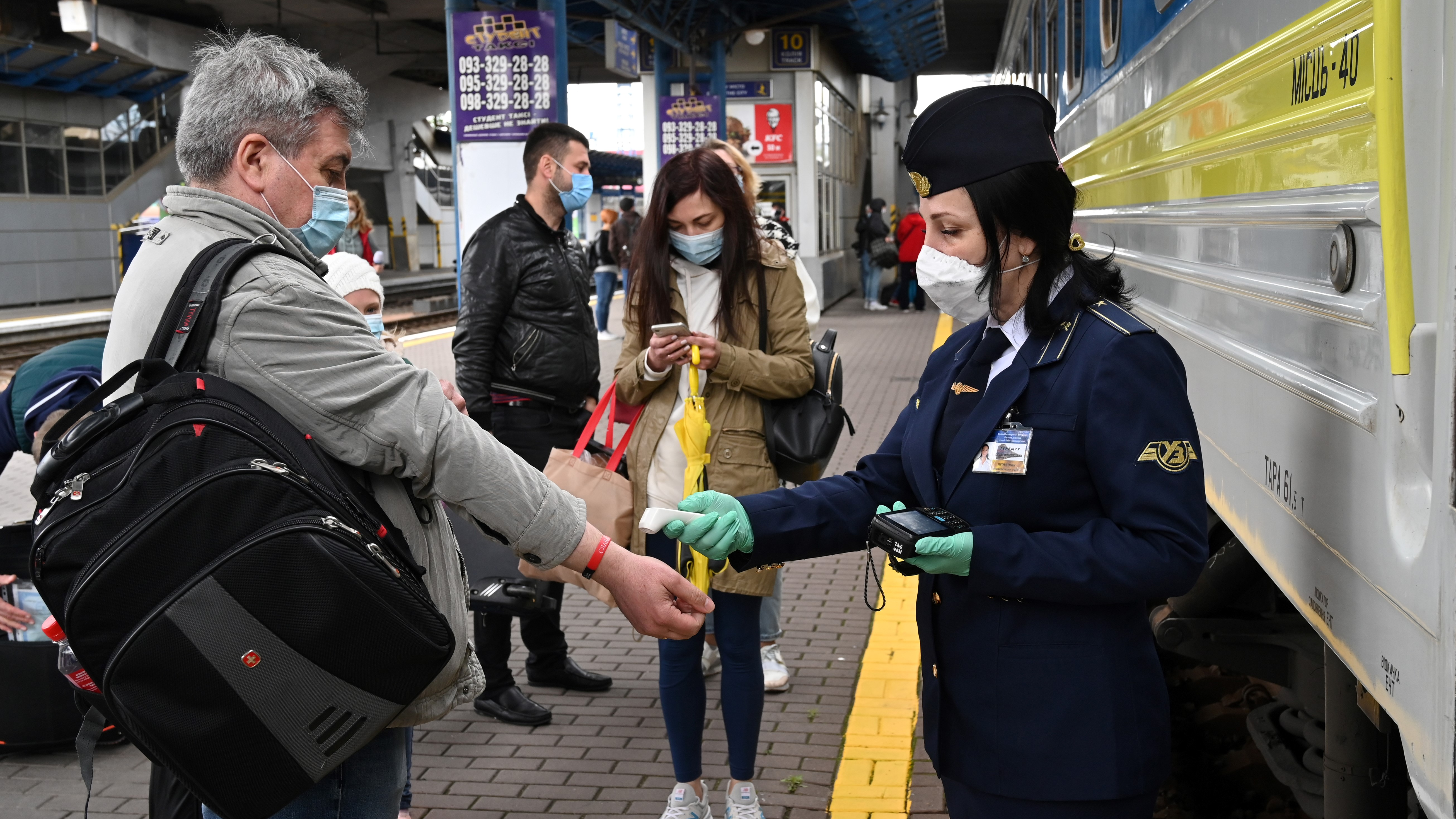 Passenger temperatures are checked at Kiev's central railway station. Genya Savilov/AFP