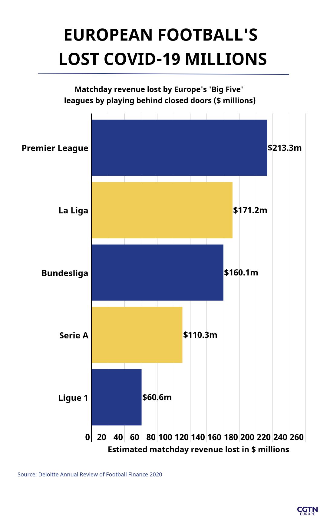 And as Europe's major football leagues gradually restart, our graphic today looks at the cost of lockdown measures on the sport in terms of clubs' lost matchday revenues in 2020.