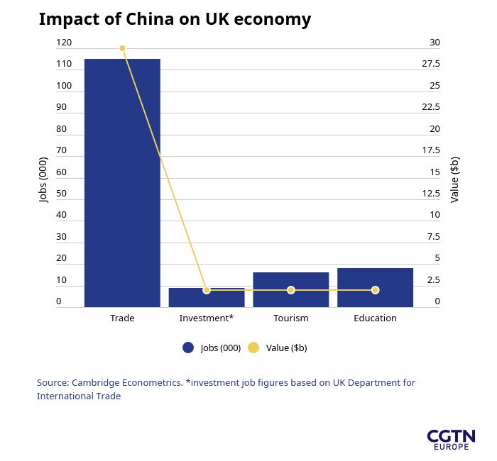 The study looked at four areas – trade, investment, tourism and education – to calculate the value of the bilateral relationship to the UK side. It was conducted by Cambridge Econometrics and commissioned by the China Britain Business Council.