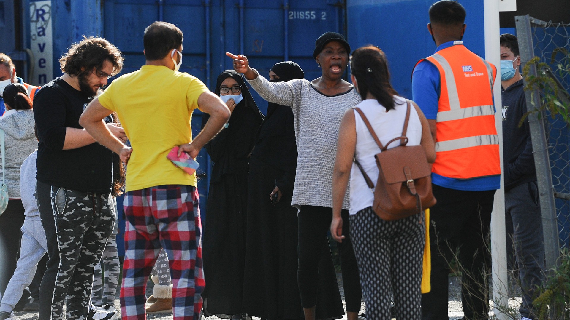 A woman reacts as an employee of the NHS Test and Trace program talks to people who arrived with an appointment but were unable to get a test in Catford, southeast London. The site closed down with members of the public still arriving. /Daniel Sorabji/AFP