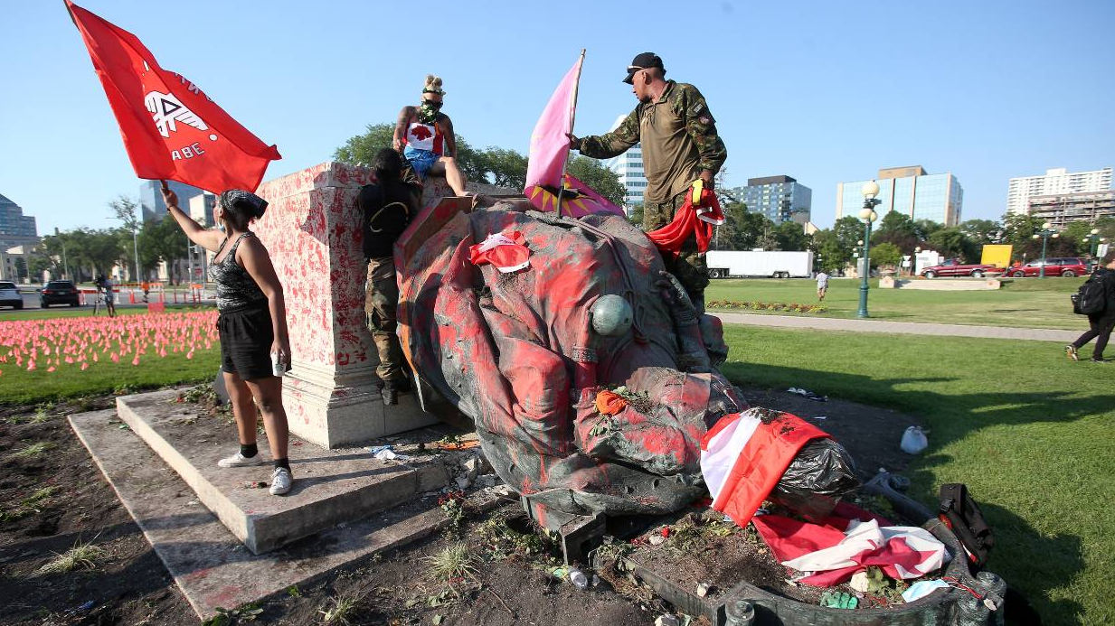 In Winnipeg, crowds cheered as the statue of the UK's former Queen Victoria was brought down outside the Manitoba provincial legislature. Protesters, wore orange clothing in honor of the victims and the statue was covered in red hand marks as many celebrated as it toppled over.