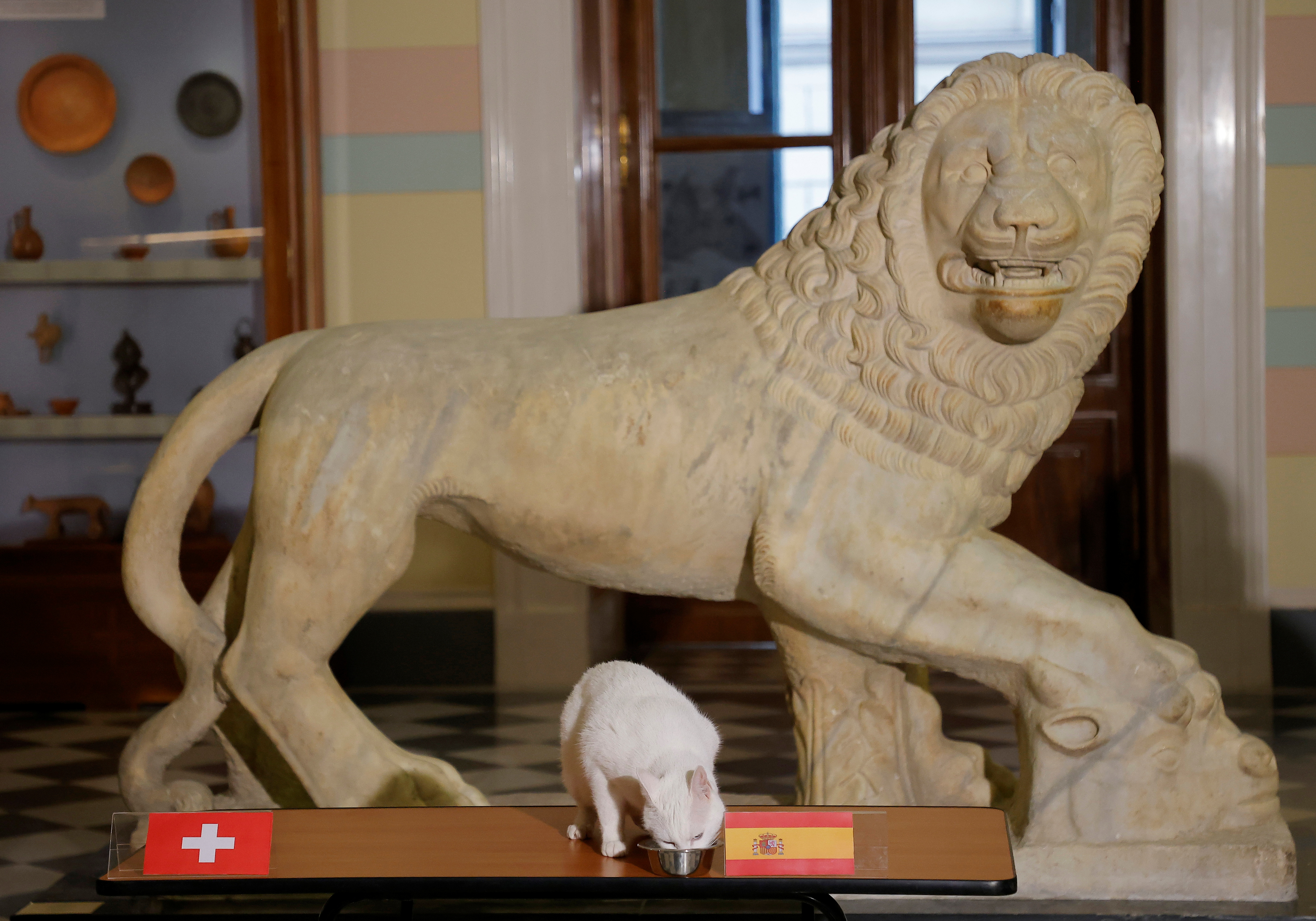 Achilles the cat, who lives in St. Petersburg's Hermitage museum, chooses Spain, while attempting to predict the result of the match with Switzerland in Russia. /Reuters/Maxim Shemetov
