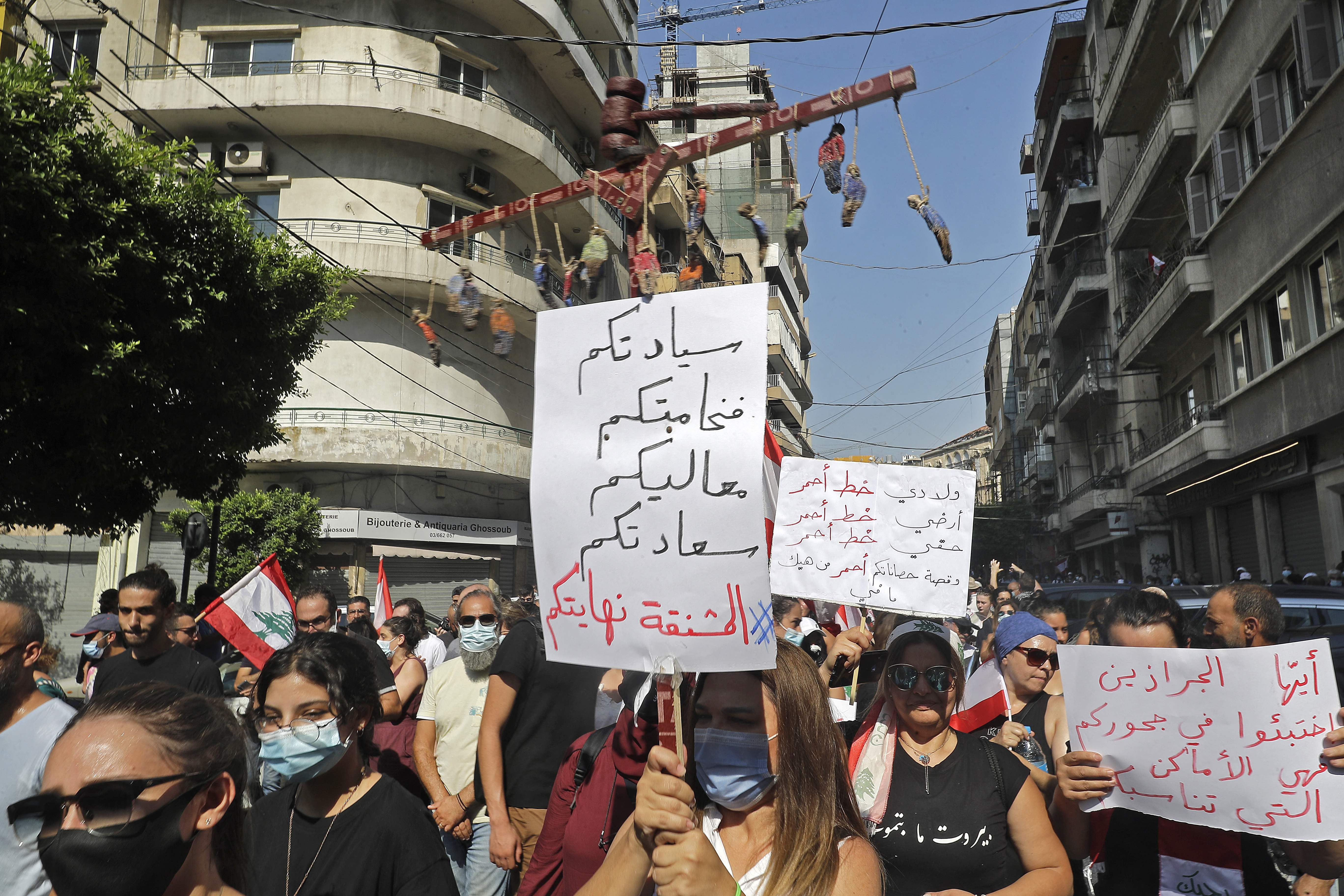 A demonstrator marches with a miniature gallows and a sign reading in Arabic underneath 'your excellency, your highness, your honor, your sereneness, the gallows is your end.' /Joseph Eid/AFP