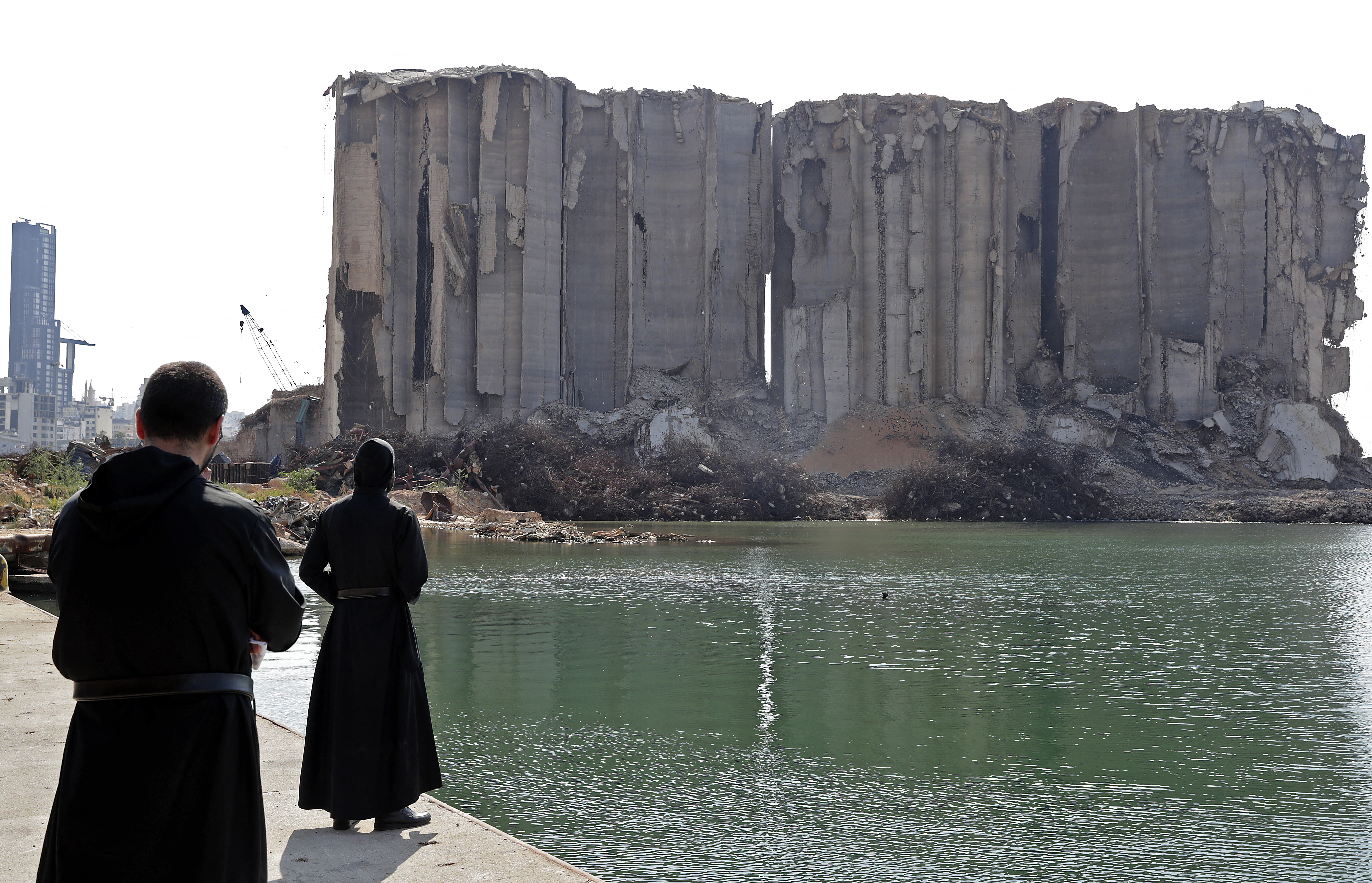 Maronite clergymen pray near the damaged grain silos at the port of Lebanon's capital. /Anwar Amro/AFP