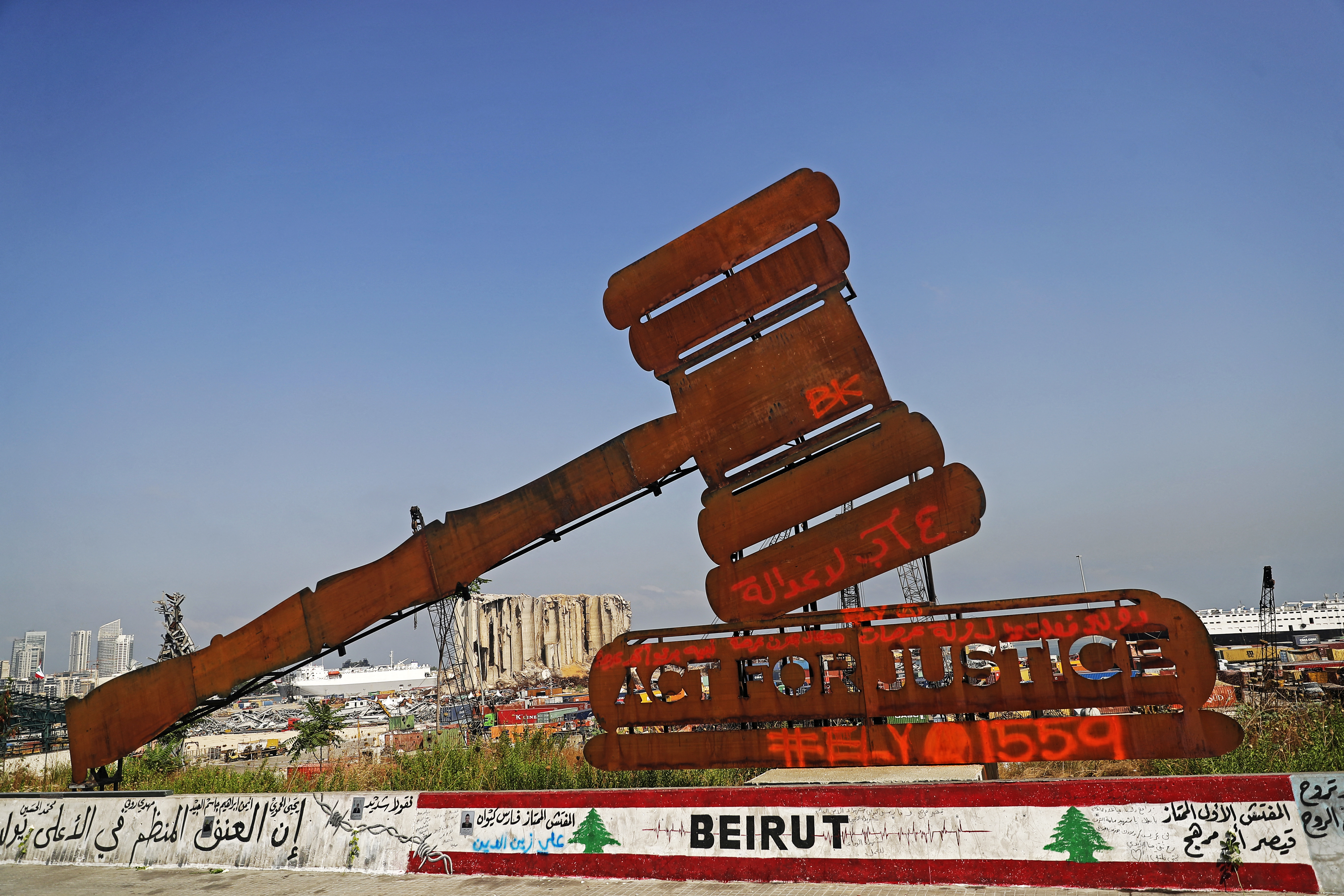A gavel monument symbolizing justice is seen in front of the damaged grain silos at the port. /Joseph Eid/AFP