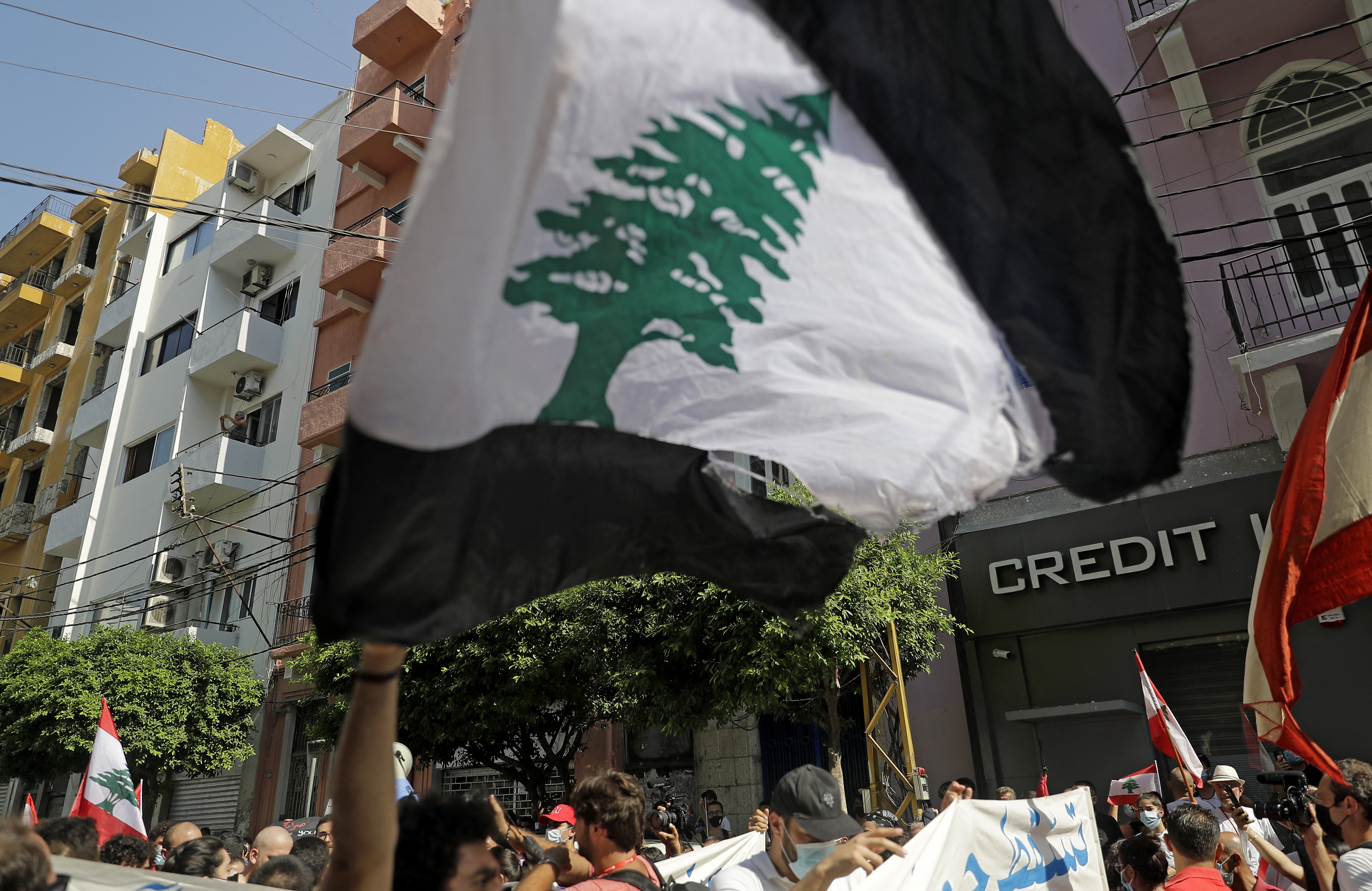 Demonstrators march with Lebanese national flags in the Gemmayze neighborhood as they head towards the port of Lebanon's capital. /Joseph Eid/AFP