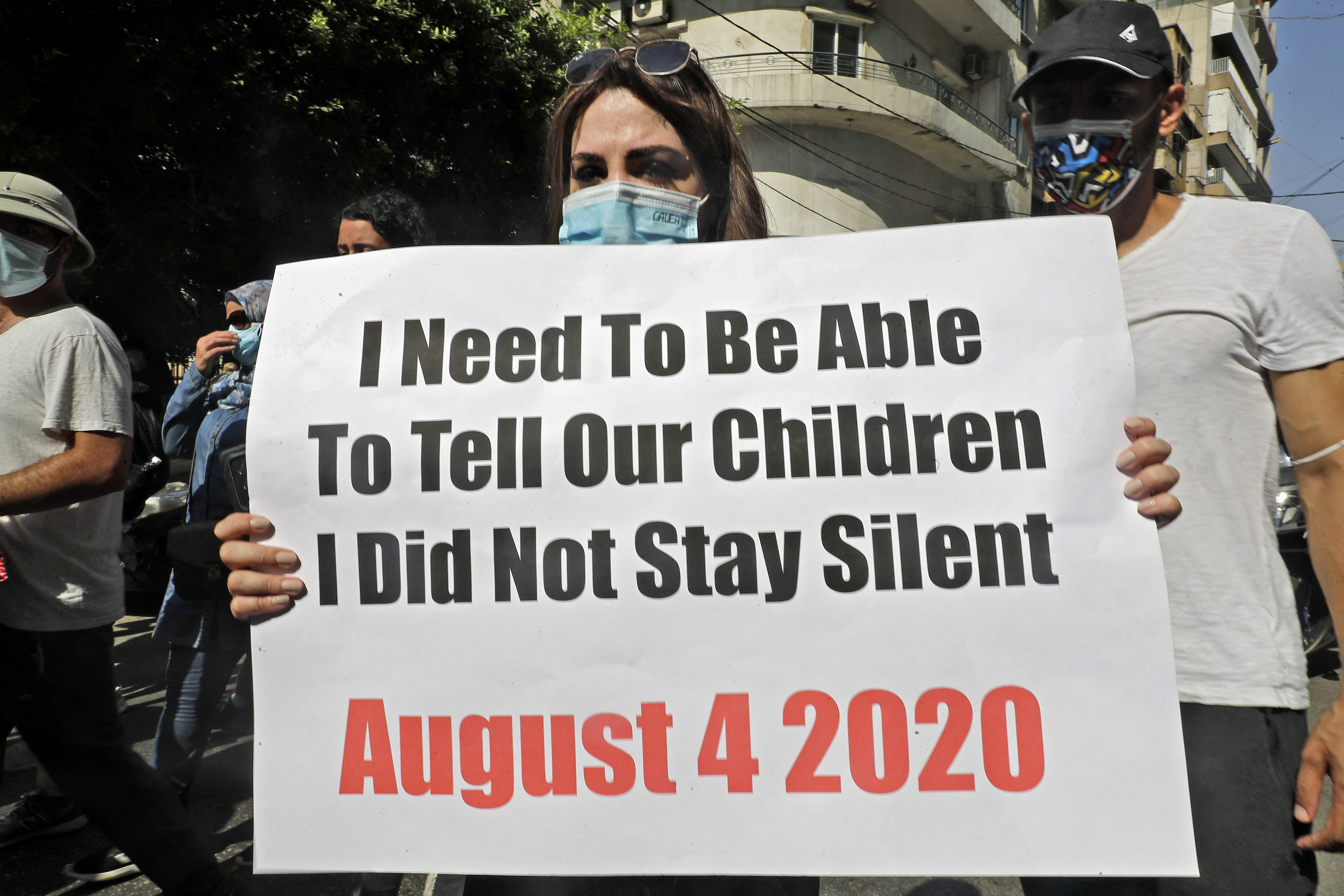 A demonstrator marches with a sign which says, 'I need to be able to tell our children I did not stay silent.' /Joseph Eid/AFP
