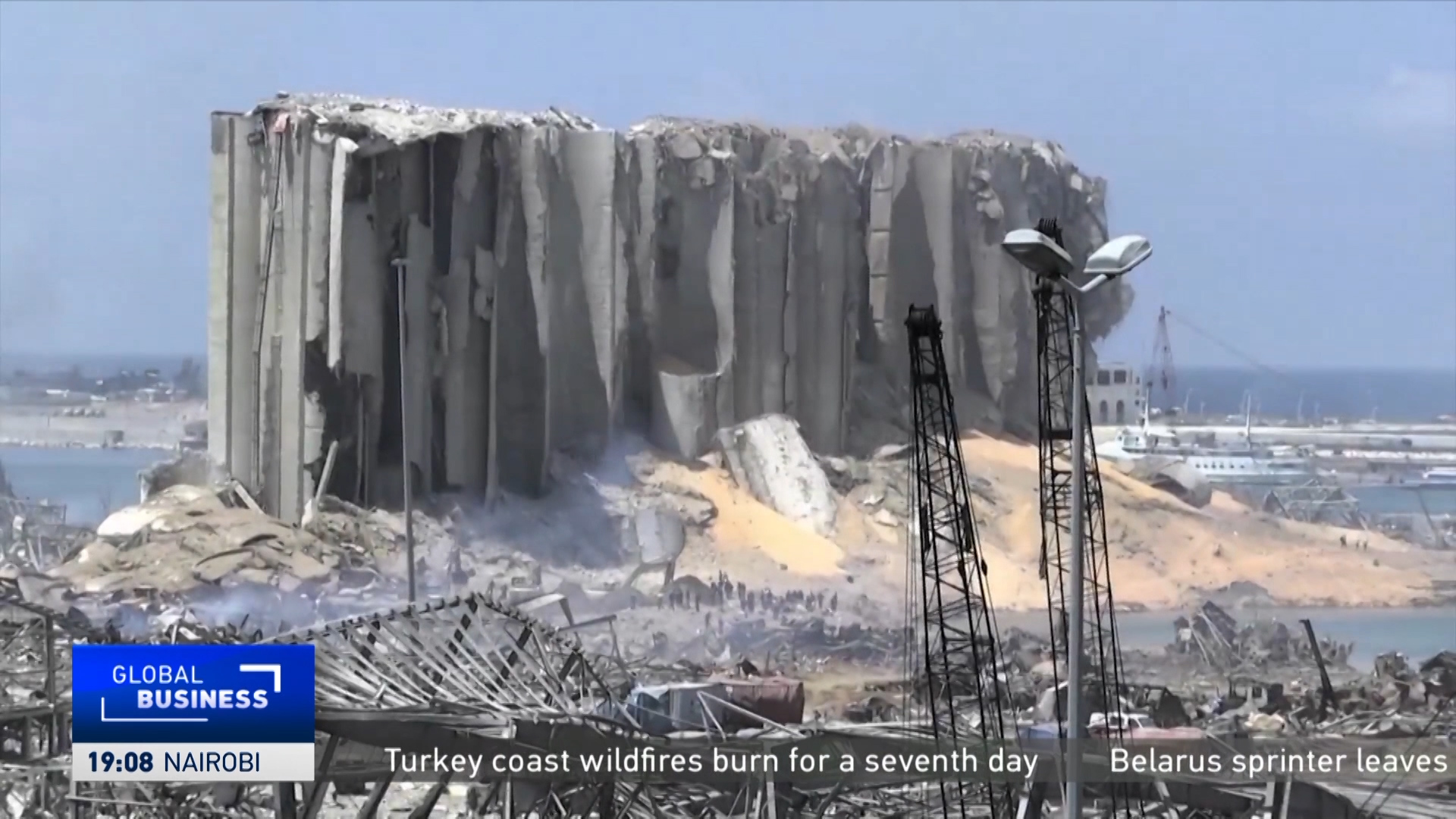 An aerial shot shows damage at Beirut port's grain silos and the area around it. /AFP