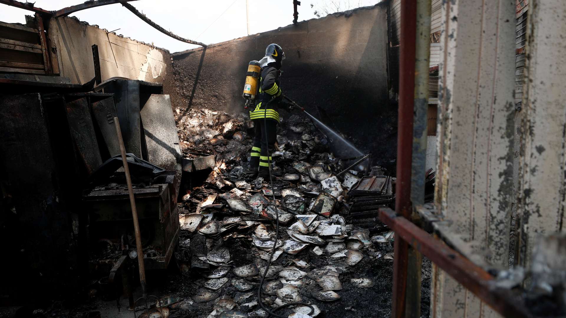 A firefighter in a fire-damaged building in Tivoli, near Rome, Italy. /Guglielmo Mangiapane/Reuters