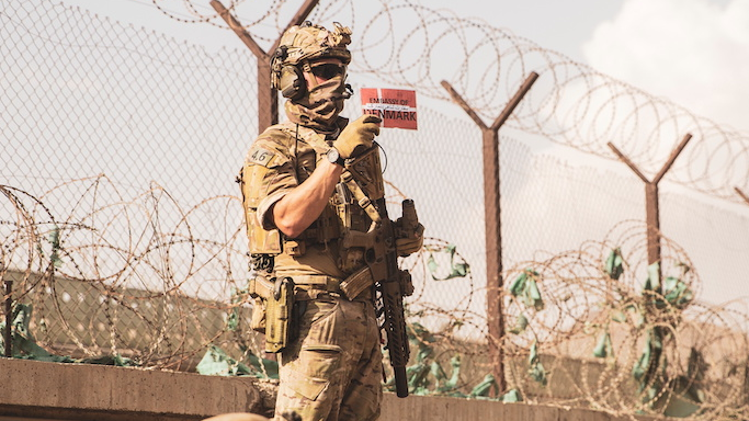 A Danish soldier at Kabul airport holds a flag to help refugees with links to the country organize evacuation. /U.S. Marine Corps/Staff Sgt. Victor Mancilla/Handout
