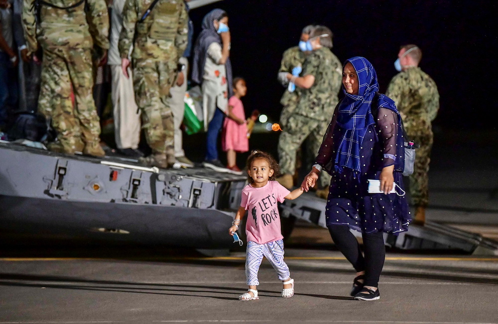 A mother and child arrive at a U.S. military base in Italy after evacuation. /U.S. Navy/Mass Communication Specialist 1st Class Daniel Young/Handout