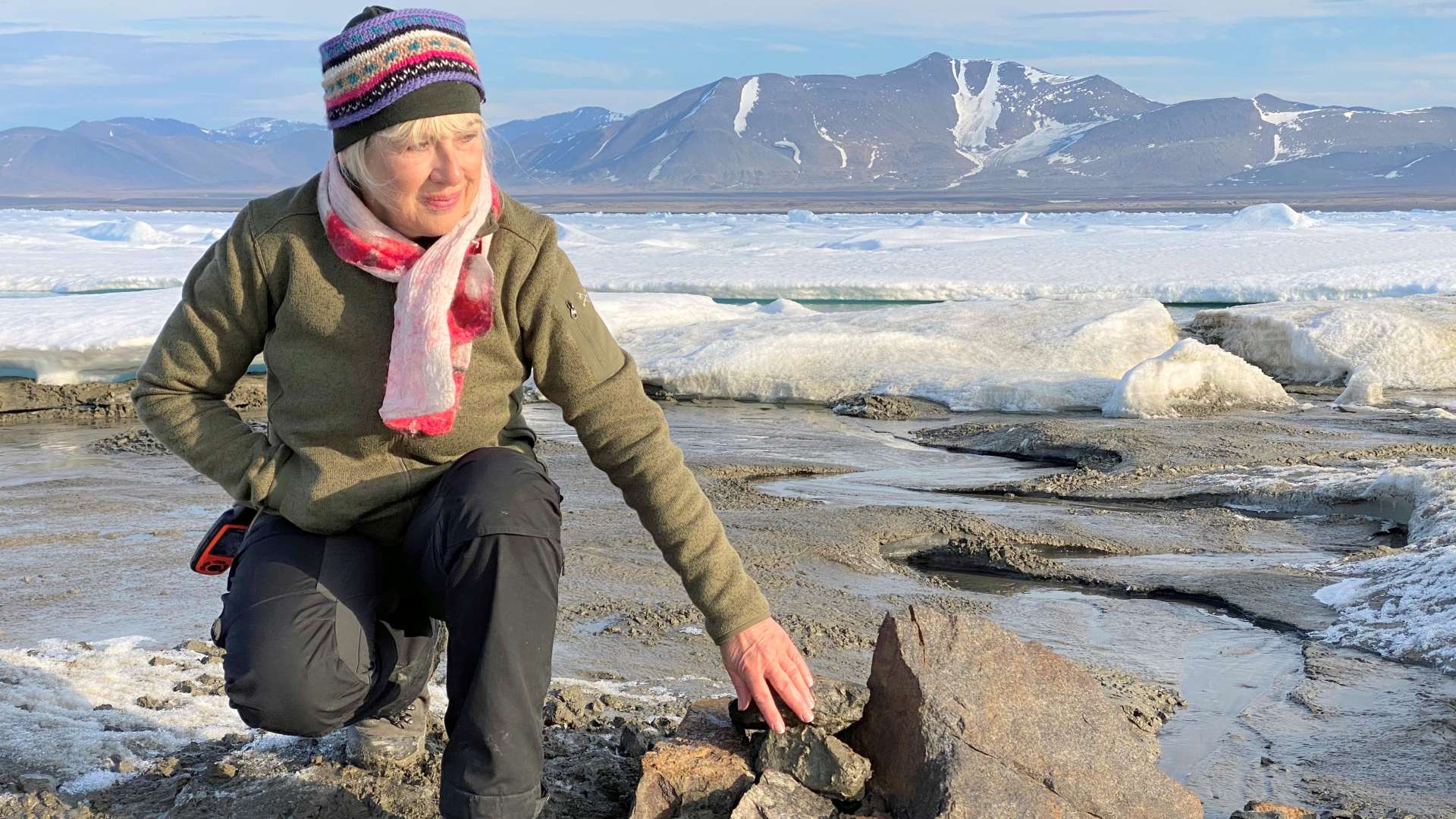 Christiane Leister, the creator of the organization that founded the expedition, the Leister Foundation, standing on the newly discovered island. /Julian Charriere/via Reuters