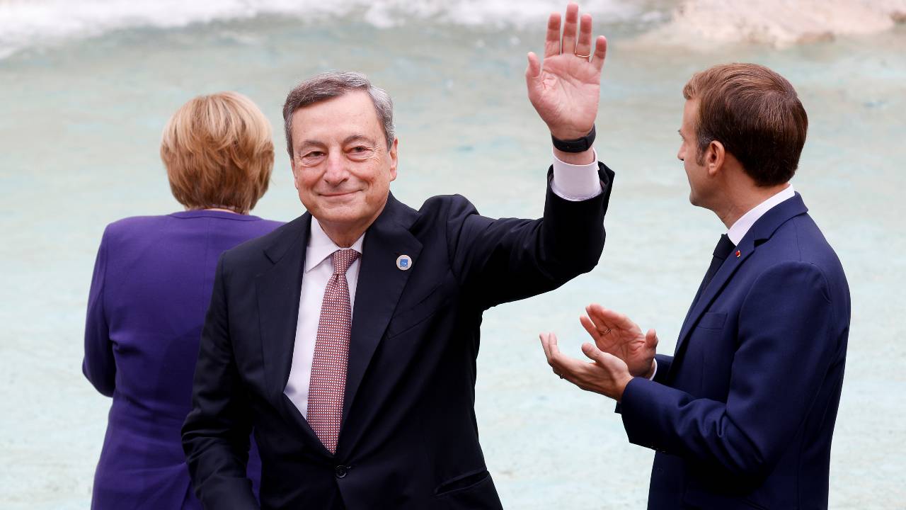 Italy's Mario Draghi, France's Emmanuel Macron and Germany's Angela Merkel at Rome's Trevi Fountain. /Guglielmo Mangiapane/Reuters