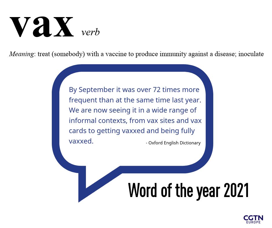 · Vax is the Oxford English dictionary's word of the year. Until 2021, the word was relatively obscure, but it has since jumped because of its derivatives, such as vax cards and getting vaxxed.