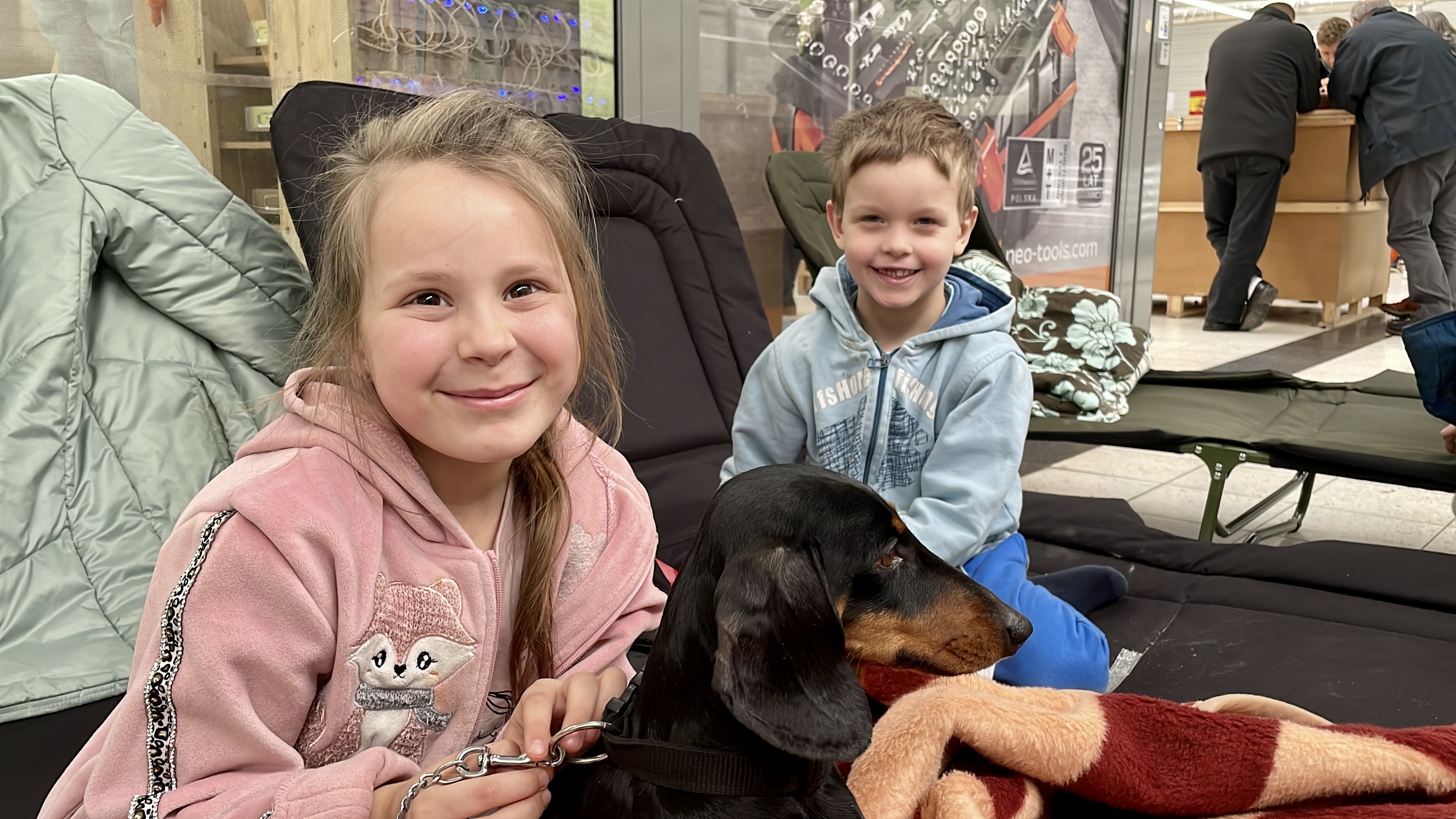 Wrapped in blankets on a small cot in the corner of a hallway, seven year old Myroslava played with her adorable little dachshund. She said she was only a " little bit" scared of the journey, but what she misses most is her dad who had to stay in Ukraine.