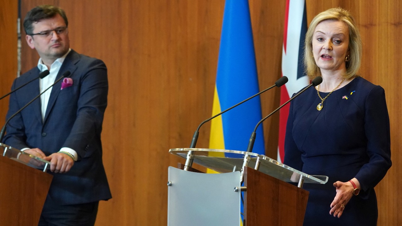 British Foreign Secretary Liz Truss (R) and Ukrainian Foreign Minister Dmytro Kuleba give a press statement at the British Embassy in Warsaw, Poland. /Janek Skarzynski/AFP