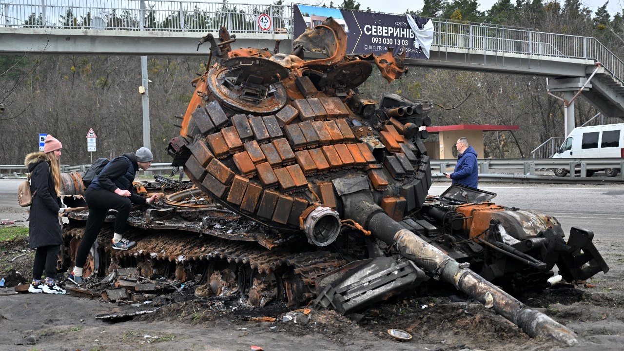 Residents look at a destroyed Russian tank on the outskirts of Buzova village, west of Kyiv. /Sergei Supinsky/AFP