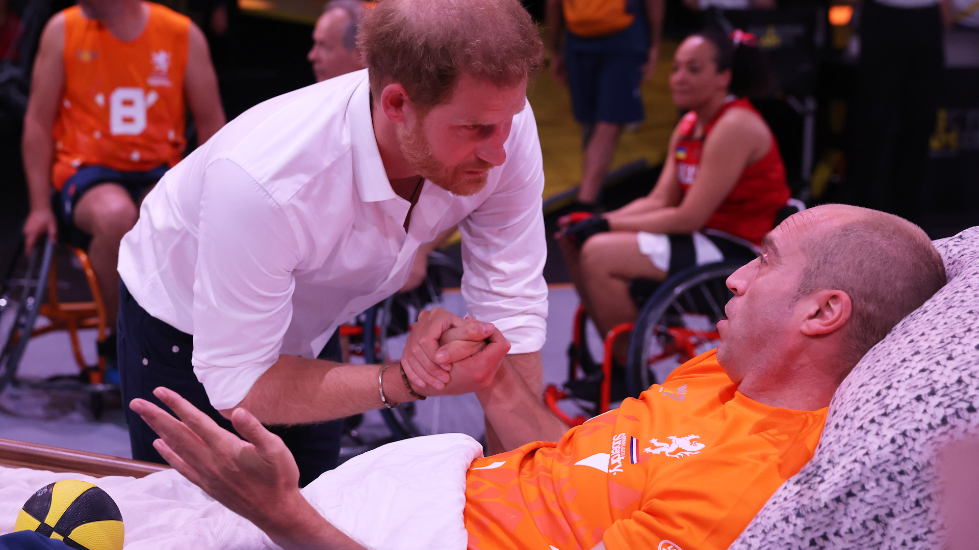 Prince Harry speaks to an injured member of the Dutch team / Getty Images for Invictus Games The Hague 2020
