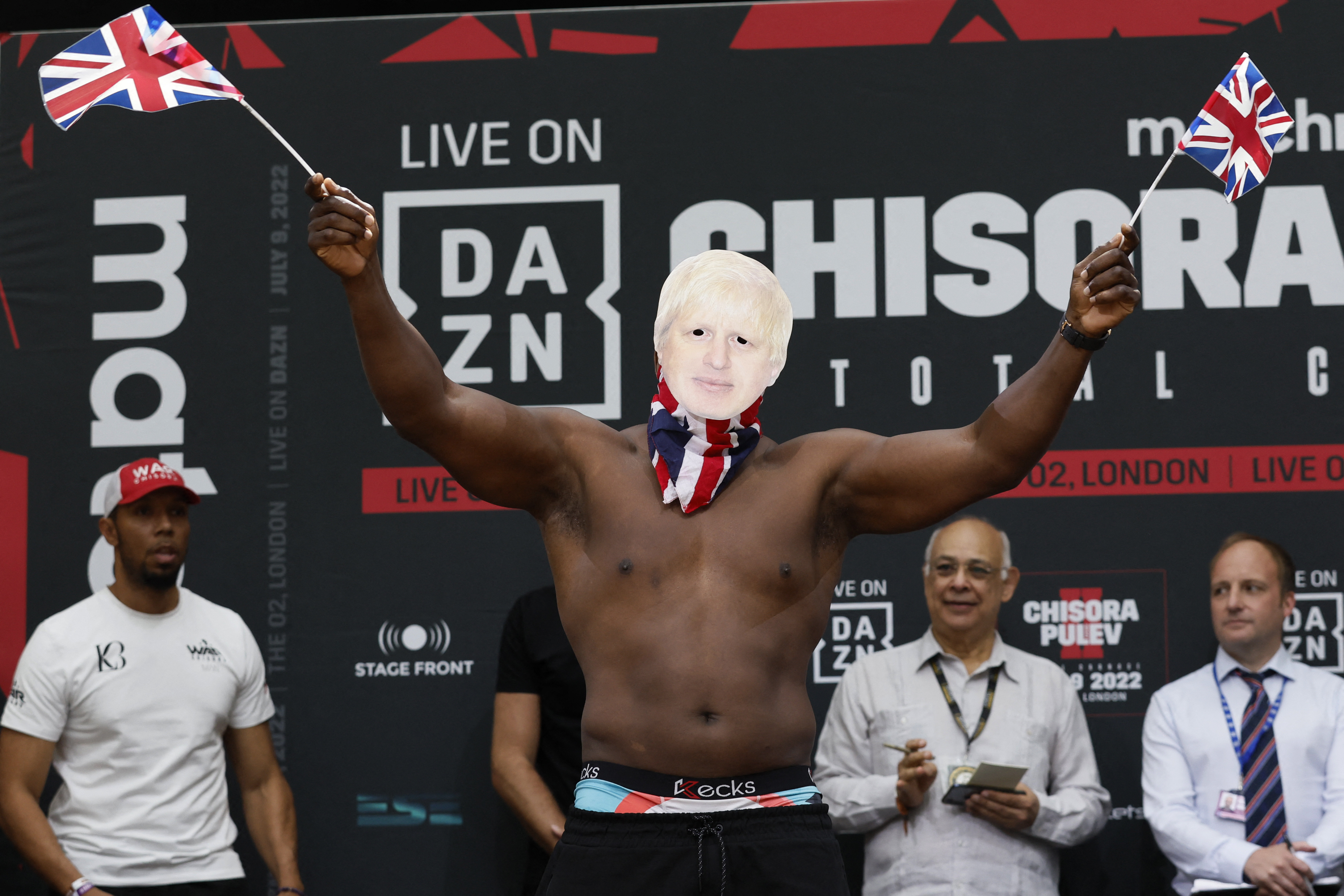 Boxer Derek Chisora wearing a British Prime Minister Boris Johnson mask during the weigh-in a day after Johnson announced his intention to resign. /Reuters/Action Images/Andrew Couldridge