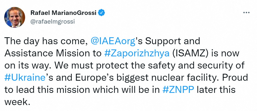 The IAEA's Director General, says that IAEA's support and assistance mission to Zaporizhzhya is on its way. /@rafaelmgrossi, Twitter/Reuters