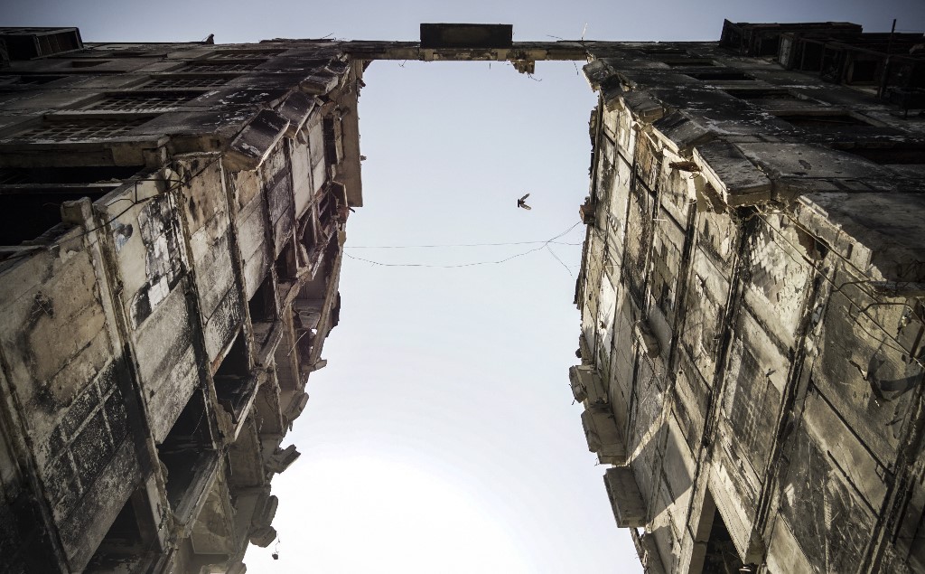 A bird flies past a ruined building in Mariupol amid the ongoing Russian military action in Ukraine. /Stringer/AFP