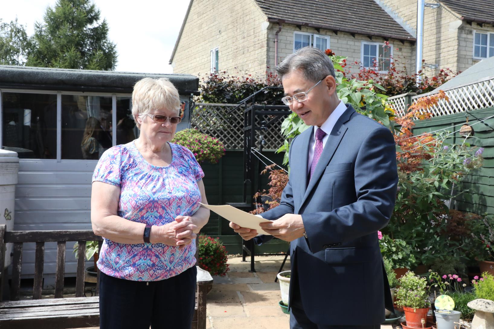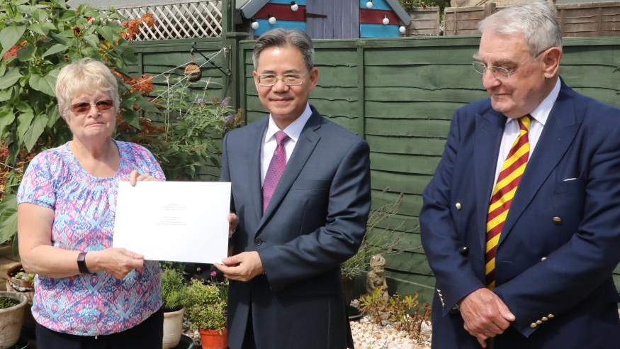 China's ambassador to the UK Zheng Zeguang presents the letter to Denise Wynne. /Chinese Embassy