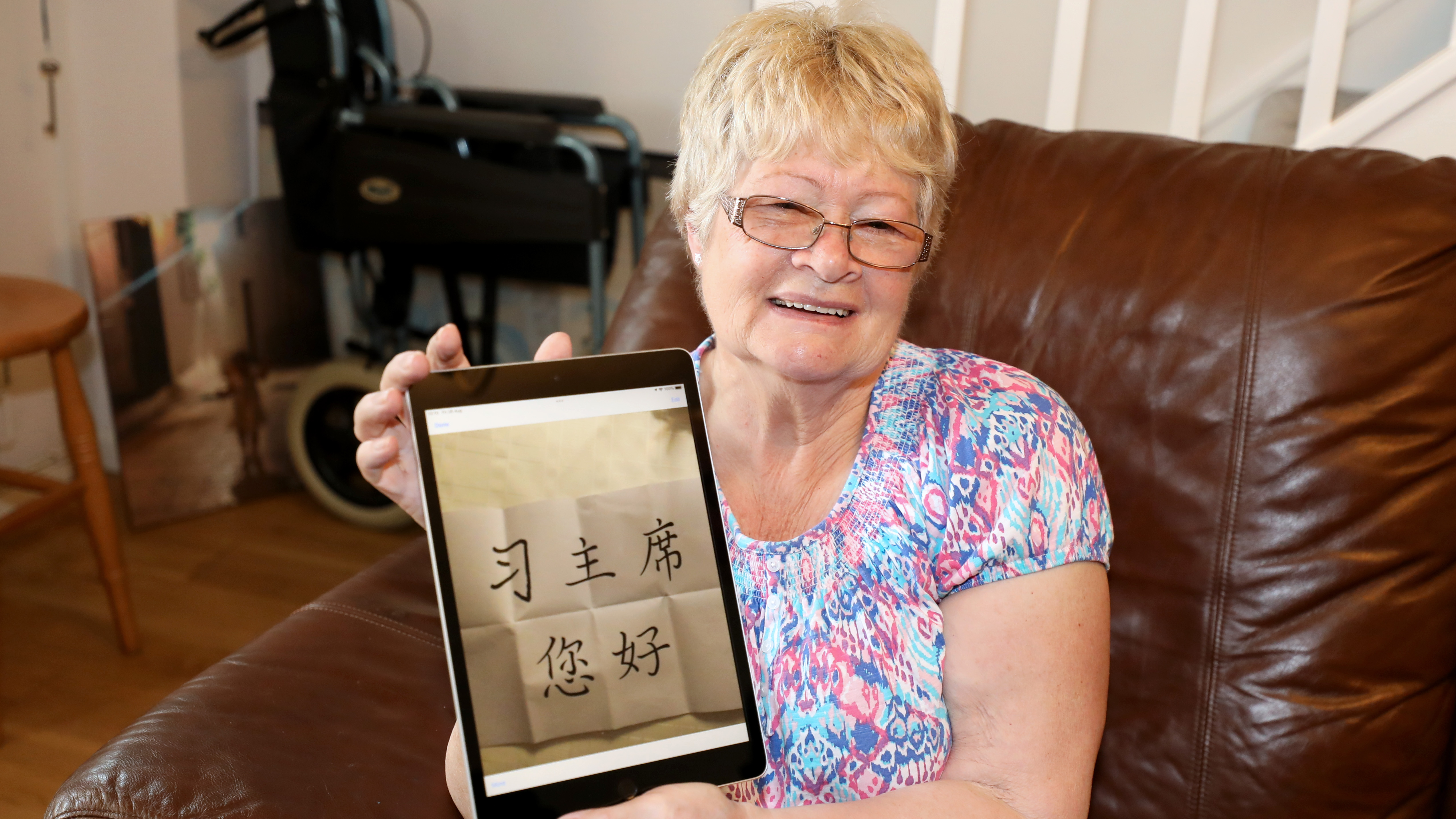 Denise Wynne holds up her tablet showing the opening of her letter to President Xi Jinping. /Chinese Embassy