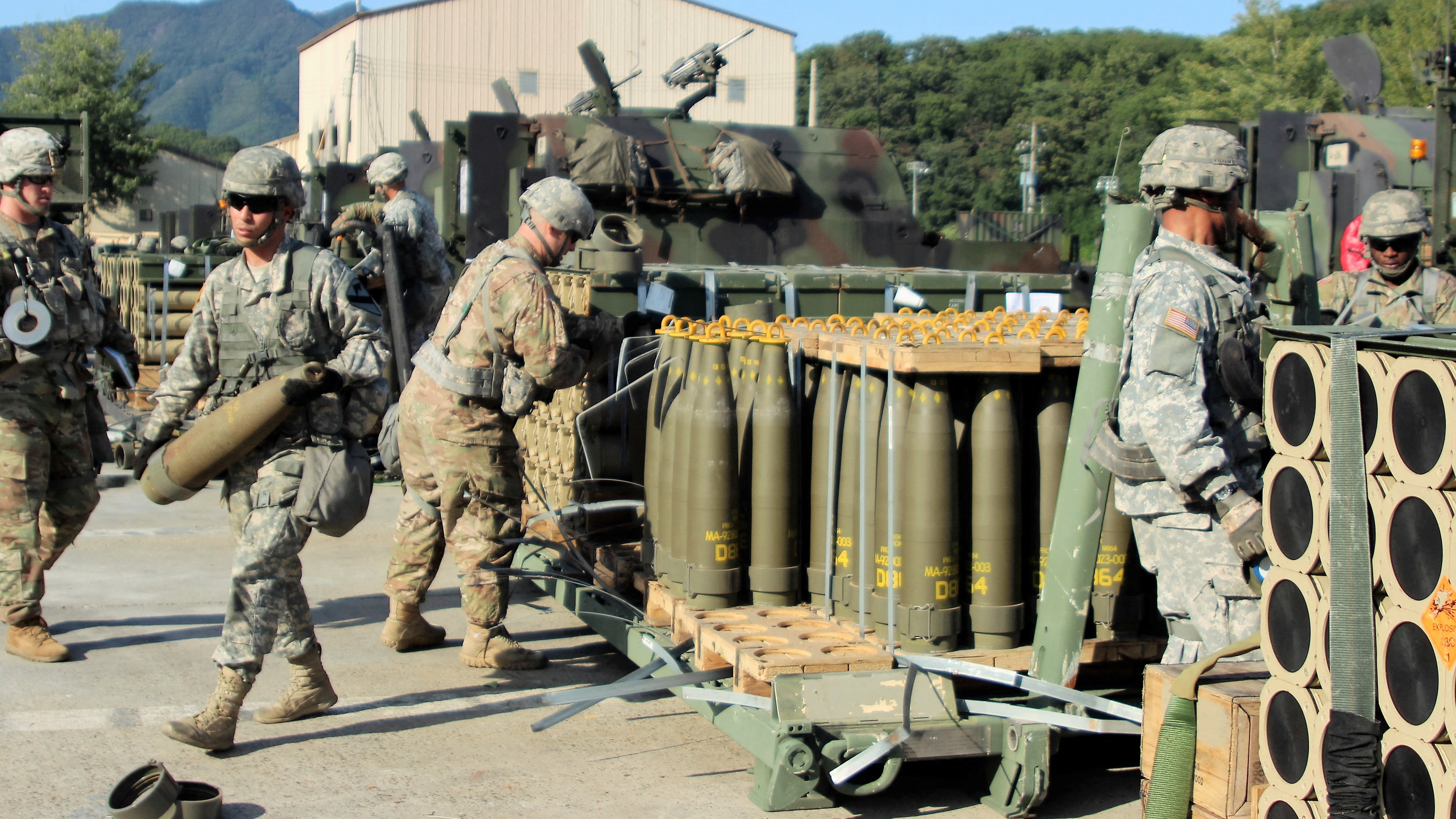 U.S. Army soldiers draw 155mm Base Burn Dual Purpose Improved Conventional Munition (DPICM) rounds. U.S. Army/ 2nd Lt. Gabriel Jenko/ Reuters