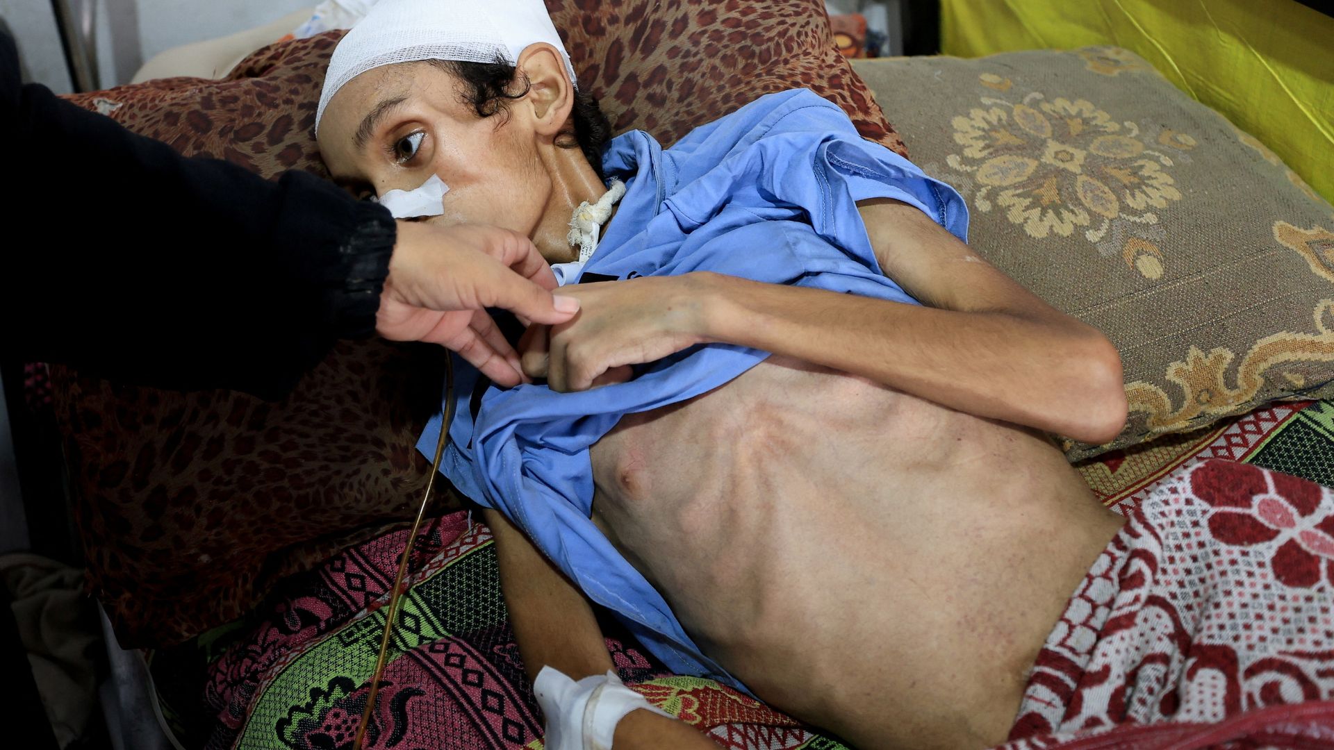 Palestinian boy Mosab Al-Debs, 14, who medics say is malnourished, lies on a bed at Al-Shifa Hospital in Gaza City. /Dawoud Abu Alkas/Reuters