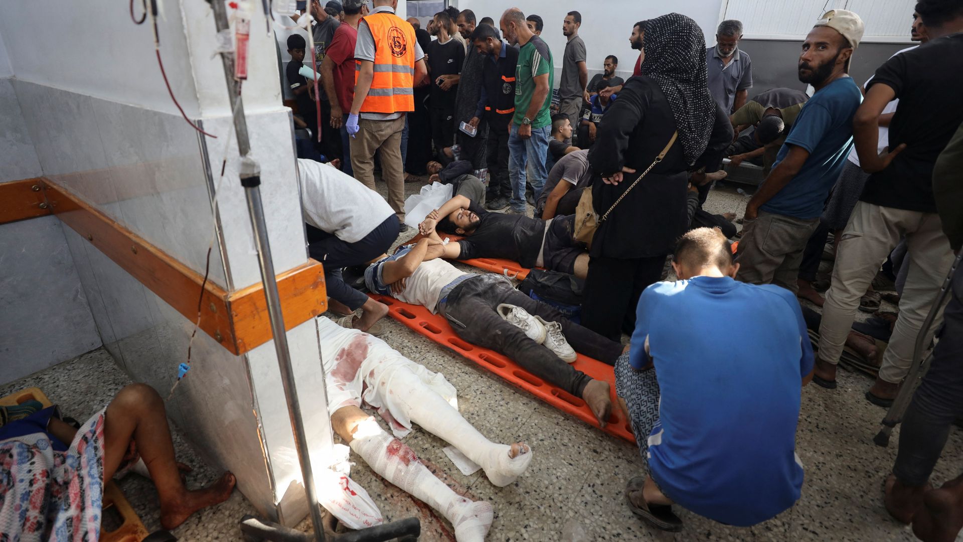 Palestinians – wounded in Israeli fire while seeking aid, according to medics – lie on the floor at Shifa hospital in Gaza City. /Khamis Al-Rifi/Reuters