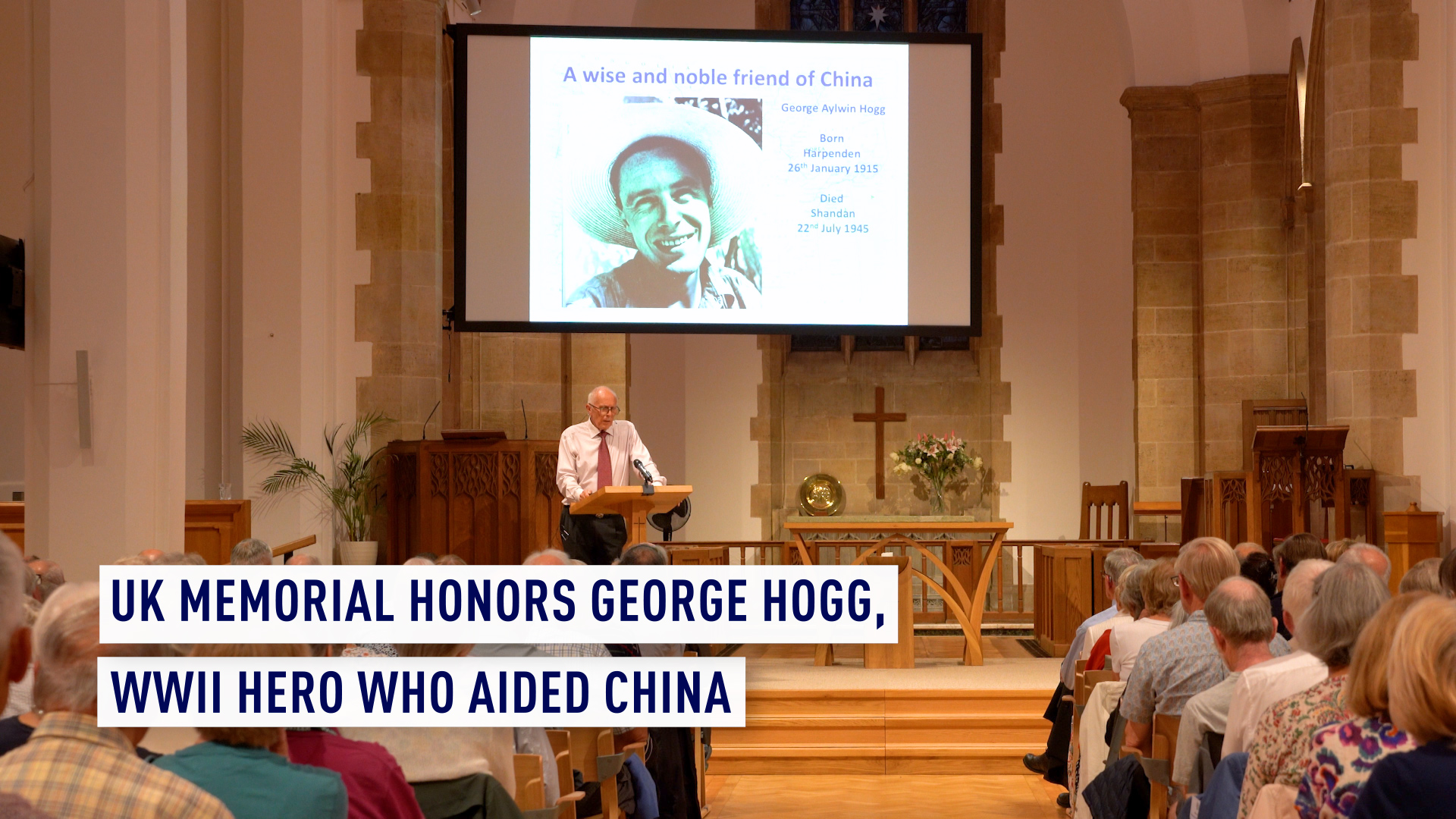 Mark Aylwin Thomas is giving a lecture at the local church about George Hogg. /CGTN Europe