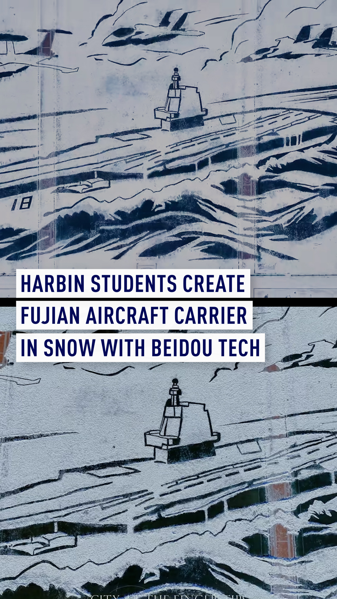 More than 1,200 students and faculty at Harbin Engineering University used BeiDou real-time positioning to map a 230-meter snow replica of China's Fujian aircraft carrier and three jets – achieving centimeter-level precision.