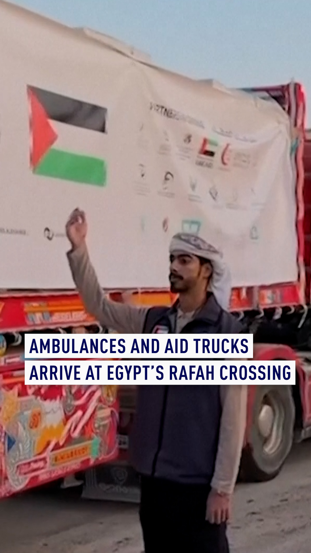 Ambulances and trucks line up to enter the Egyptian gate of the Rafah crossing on the way to the Gaza Strip on Sunday. /Mohamed Arafat/AP